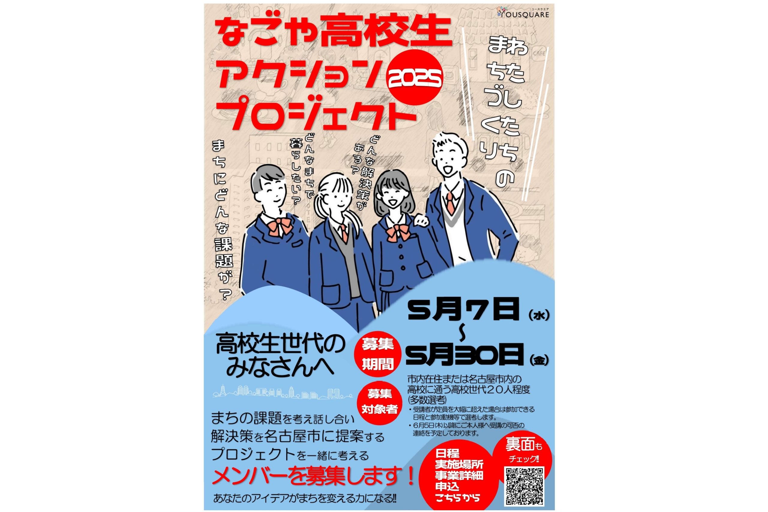 名古屋市内在住、または名古屋市内の高校に通う高校生世代が社会や地域の課題を考え、その課題解決に向けた提案を名古屋市に行います。