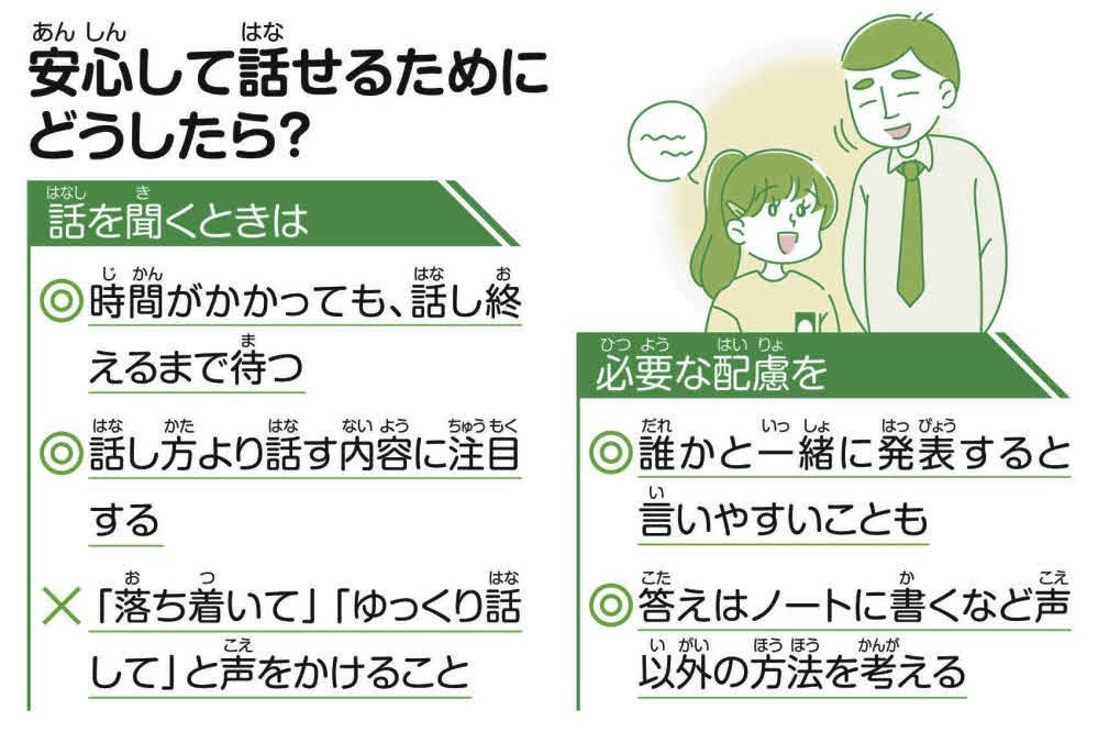 重松さんは無事に高校に入学。現在も、授業での音読などは苦手ですが、1人では無理でも、誰かと一緒なら読むことができることも。「(もし吃音がある友達がいたら)その子の希望を聞いた上で、一緒に取り組むなどの手助けをしてほしい」と話しました。