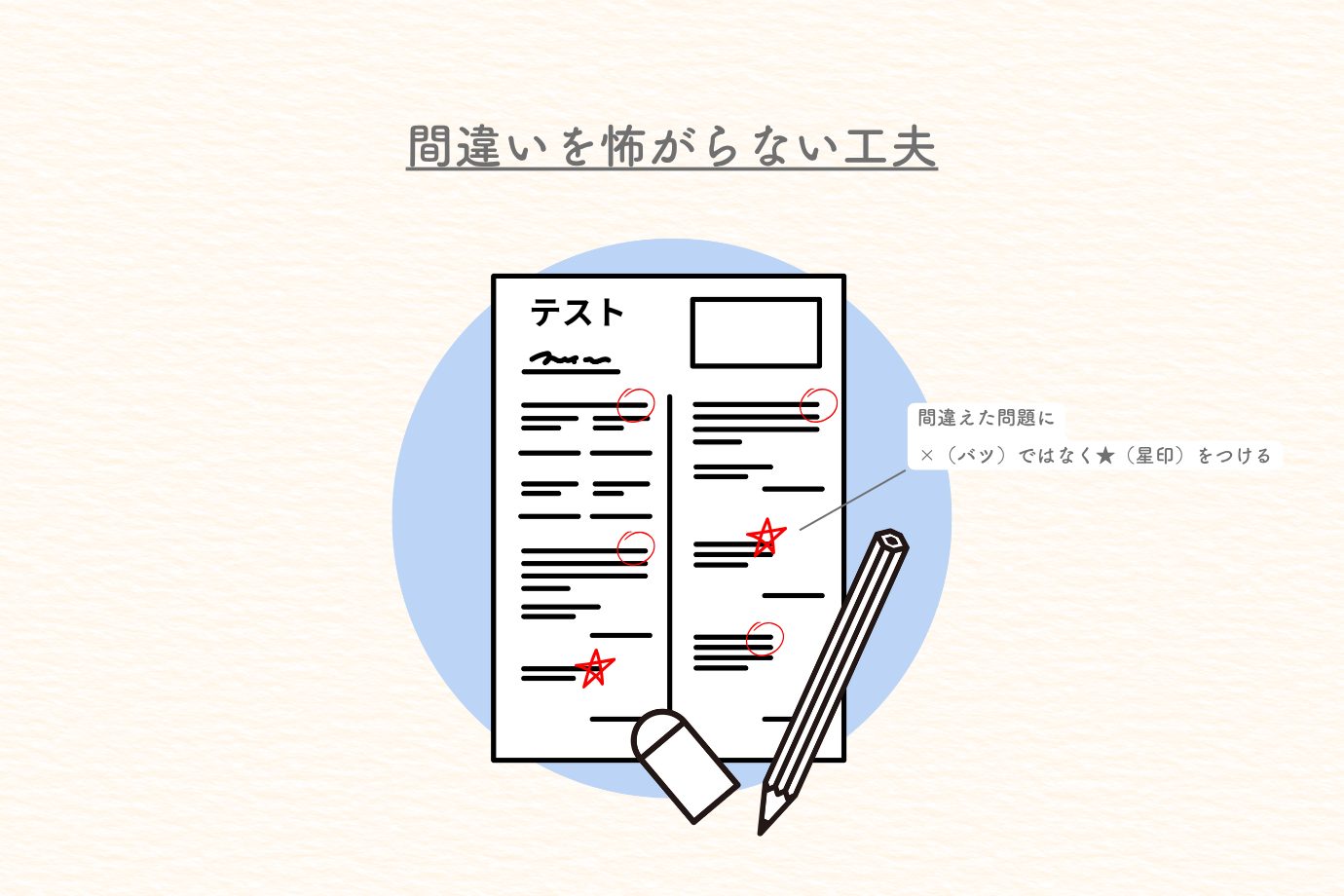 低学年の子には「安心感」が必要です。間違えることを嫌がる子には「×じゃなくて星印にしてごらん」と言うと、×をつけるということに抵抗感を持っている生徒さんでも素直につけてくれることもあります。