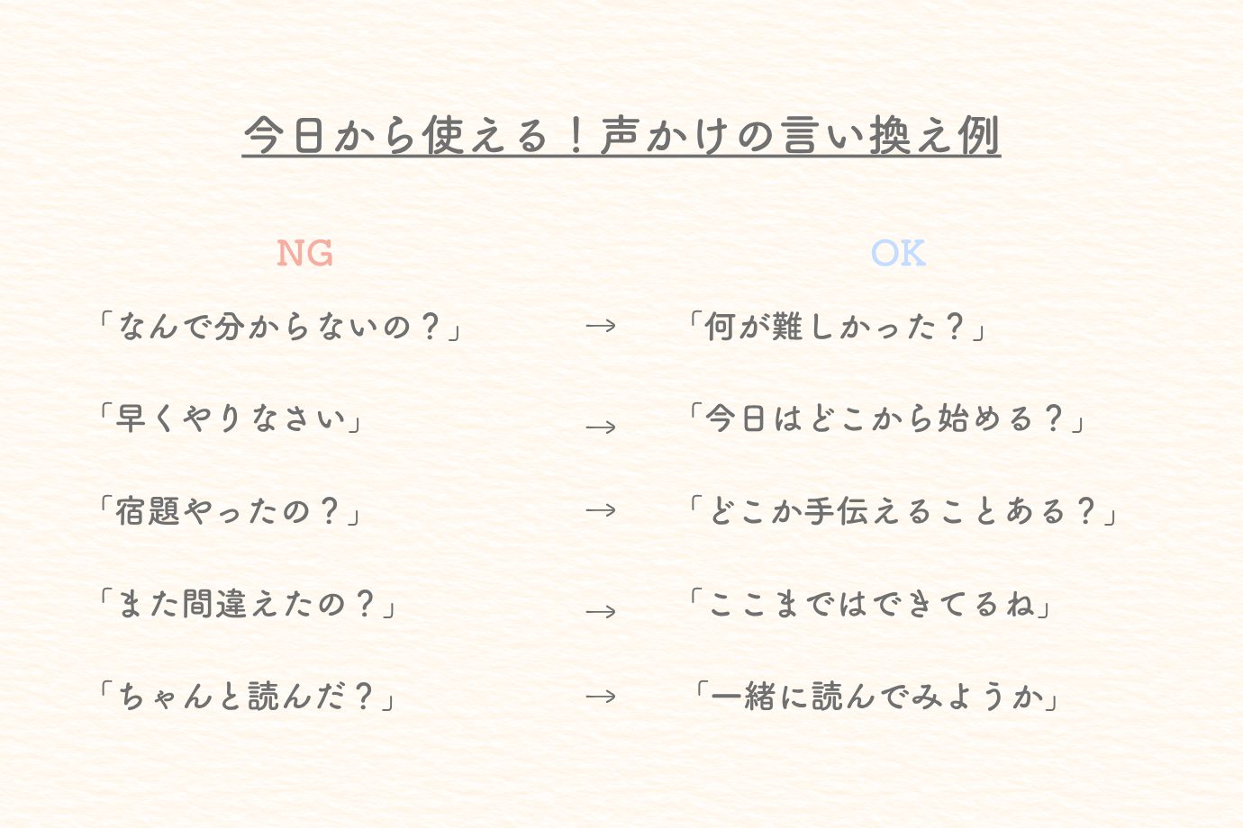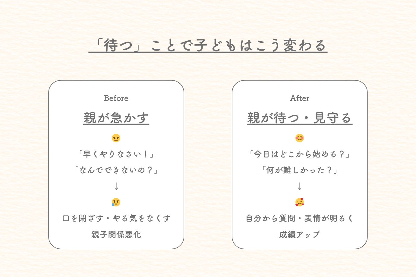 今日から声かけを1つ変えてみましょう。例えば、「宿題やったの?」を「今日はどこから始める?」などと。結果より「過程を認める言葉」を使ってみてください。