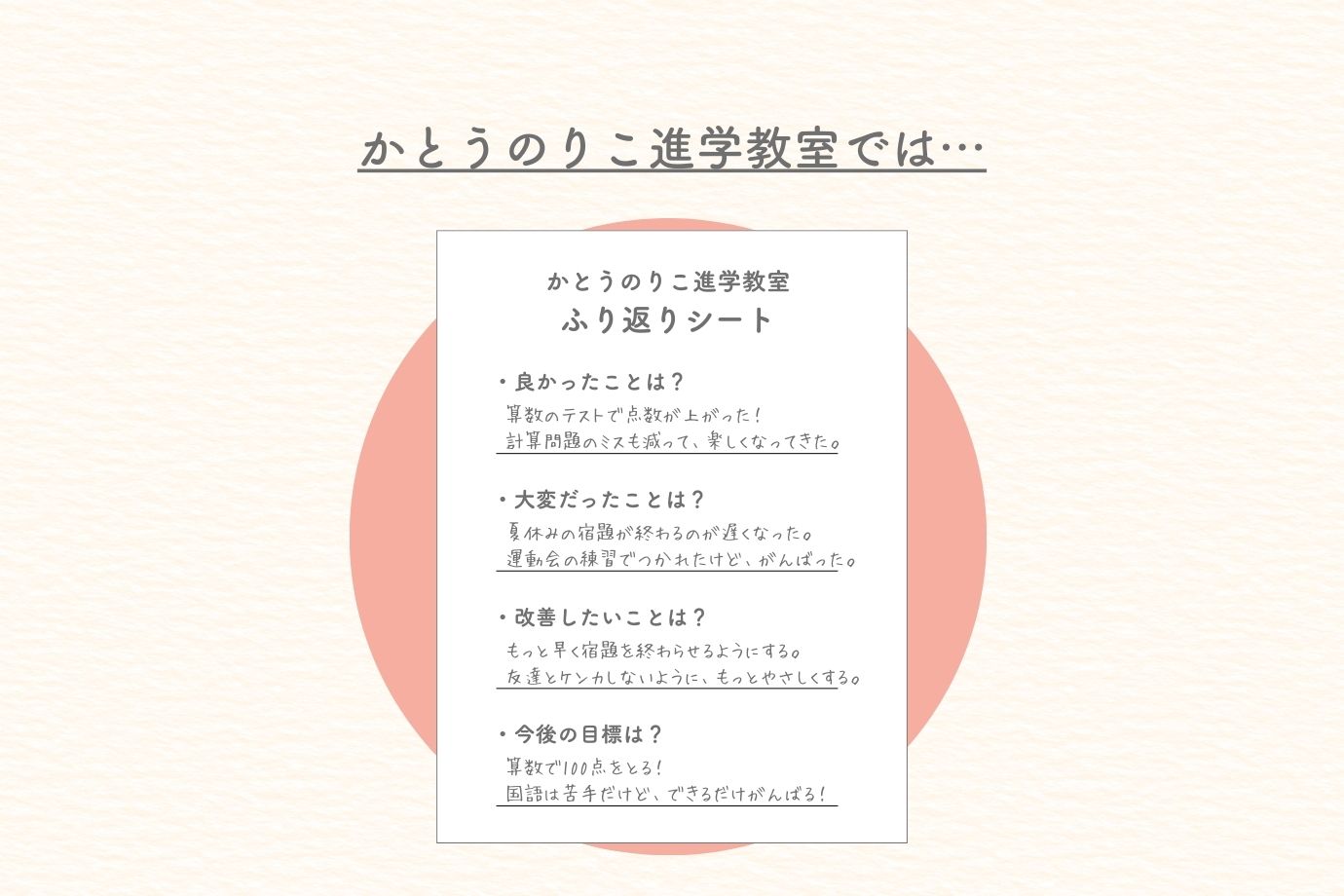 「問題を解く時間が早くなった」や「計算問題のミスが減った」など、生徒のあげる“がんばり”はさまざま。反省ではなく、自分ができるようになったことに目を向ける時間にするのが重要です。