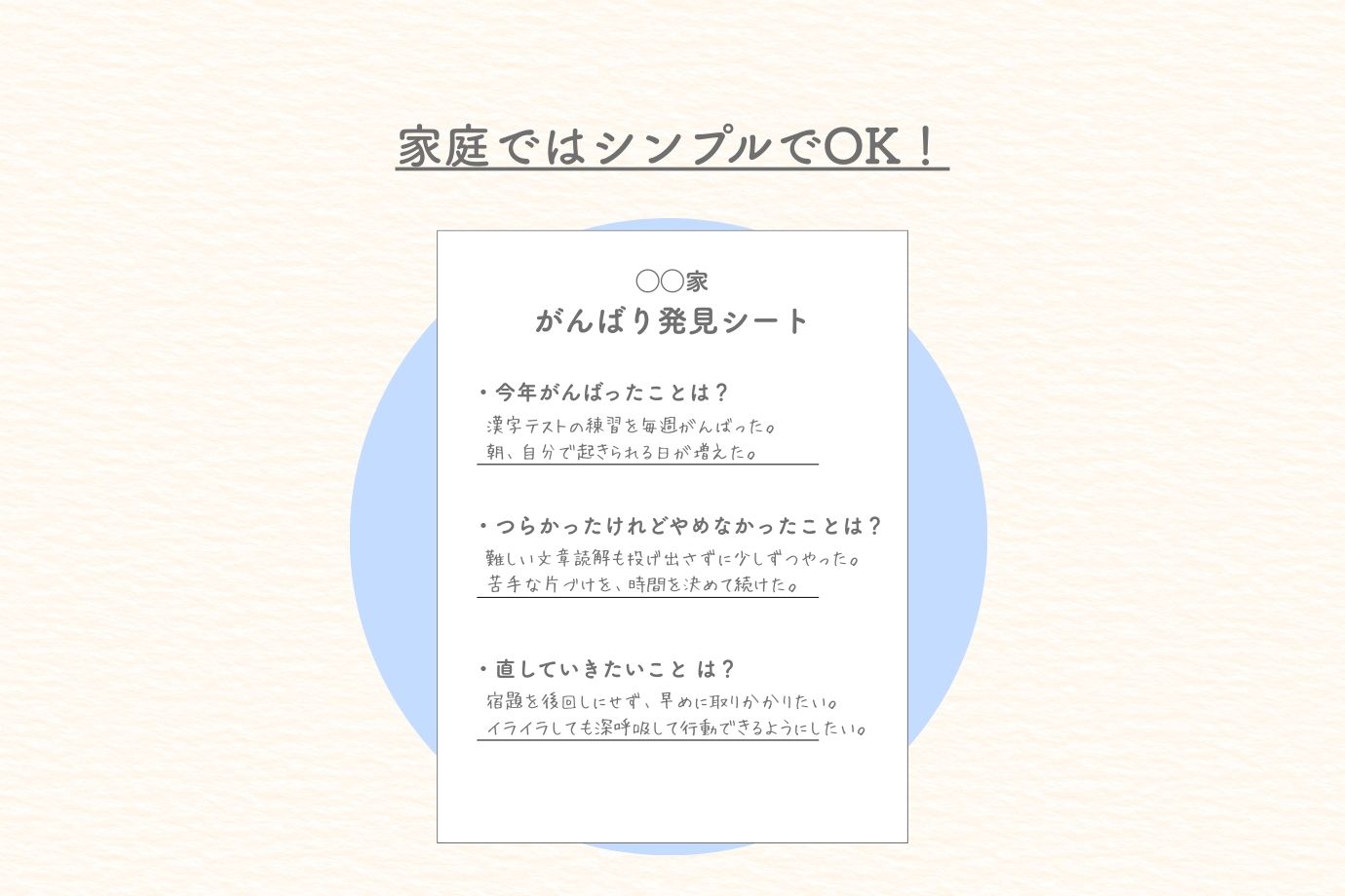 塾では、学習内容をふり返り次につなげる「ふり返りシート」を使っていますが、家庭では、子どものがんばりや成長を“見つける”ことを目的にした「がんばり発見シート」として取り組むのがおすすめです。まずは、今年をふり返る時間をつくってみましょう。